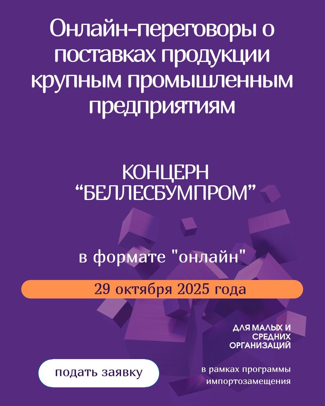 29 октября 2025 года с 10:00 до 13:00 часов в рамках контактно – кооперационной биржи планируется проведение онлайн-переговоров с организациями концерна «Беллесбумпром»: ОАО «СКБЗ «Альбертин», Филиал «Добрушская бумажная фабрика «Герой труда», ОАО «Управляющая компания холдинга «Белорусские обои», РУП «Завод газетной бумаги», ОАО «Бумажная фабрика «Спартак», ОАО «Светлогорский ЦКК», ОАО «Борисовский ДОК», ОАО «Ивацевичдрев», ОАО «Речицадрев», ОАО «Борисовдрев».
