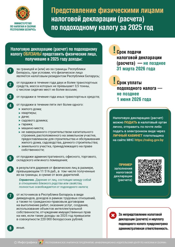 Инспекция Министерства по налогам и сборам Республики Беларусь по Солигорскому району (далее-инспекция) информирует, что срок представления налоговой декларации (расчета) по подоходному налогу с физических лиц (далее – налоговая декларация) в отношении доходов, полученных в 2025 году, не позднее 31 марта 2026 года.